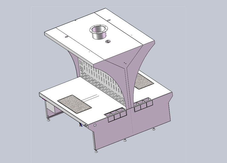 The dual station workbench is a general-purpose workbench. The unique desktop design is very perfect. It has a dust collection system. The negative pressure generated by the smoke and dust through the fan enters the dust removal pipeline through the exhaust port, and is collected in the pulse dust collector for filtration treatment. The purified air is discharged through the air duct and the fan.