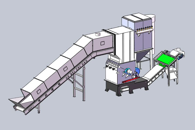 破碎机上料输送采用密闭装置不漏料,与破碎机入料口采用软连接密封,密封效果 更好,可防止物料在破碎时间飞出,避免人员受到伤害;配置自动输料出料装置,实现自动化生产,保证生产效率和人员安全。