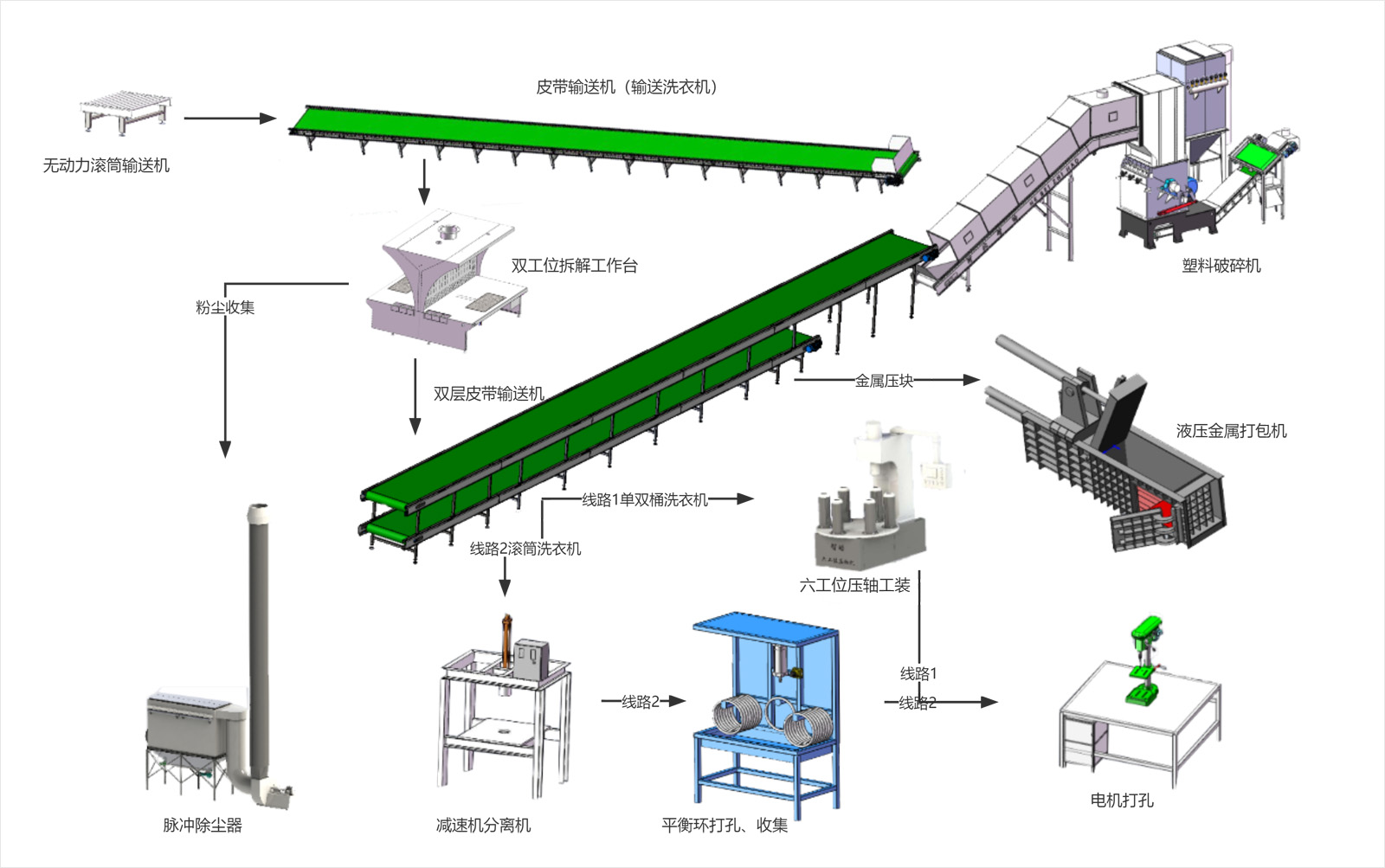 配套设备所有电气元件采用三菱/NSK/法国施耐德等进口品牌,配机电缆均采用国内一线品牌,符合国家强制标准。生产线分选铁回收率≥99.5%,塑料分选率≥98%。